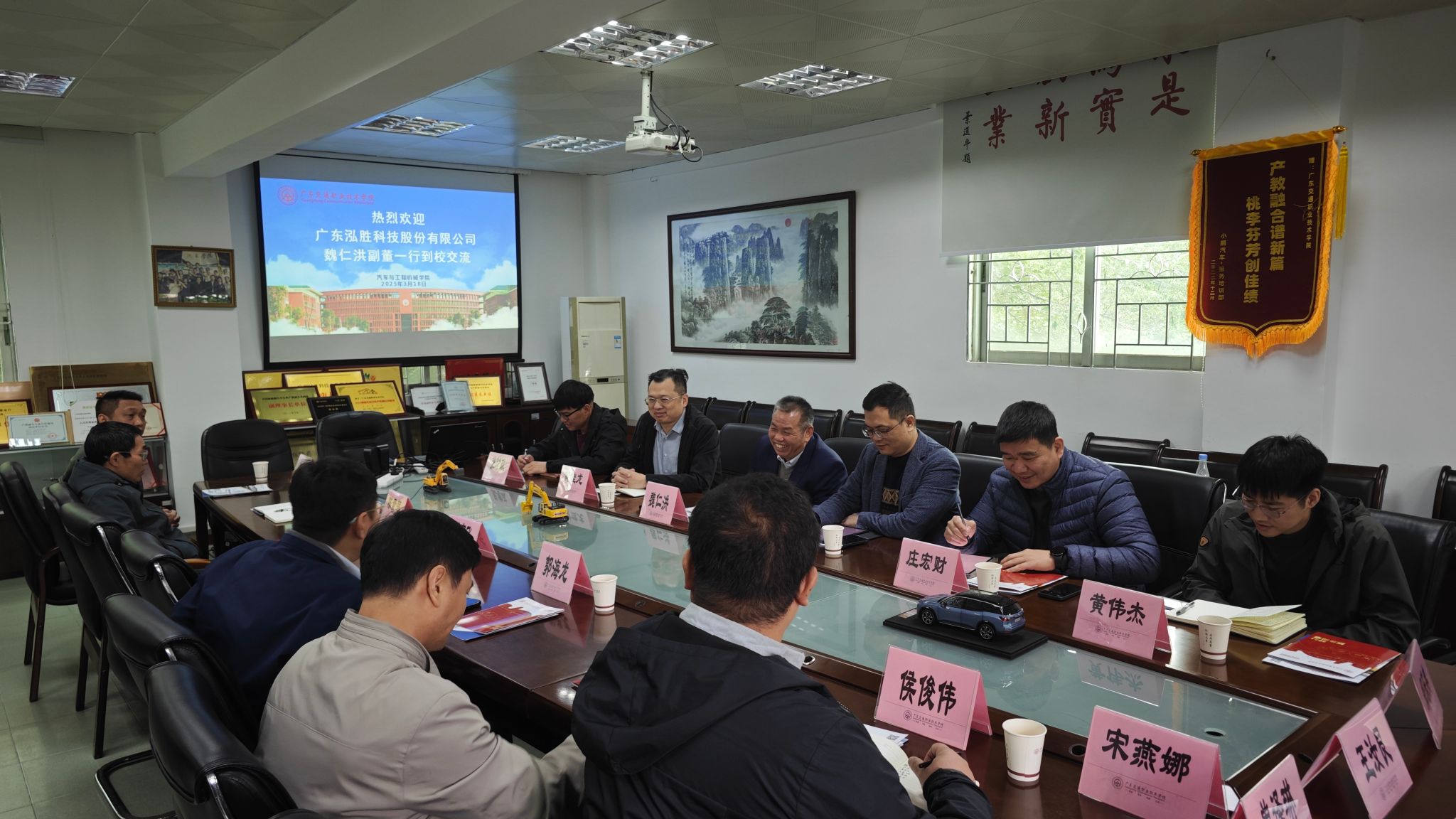 3月18日,优秀校友、广东泓胜科技股份有限公司副董魏仁洪一行莅临汽车与工程机械学院交流指导,汽车与工程机械学院党委书记陈素莲、院长郭海龙、副书记郭卫城、副院长肖心远、张胜宾以及学科骨干成员和相关教师参加交流座谈会。