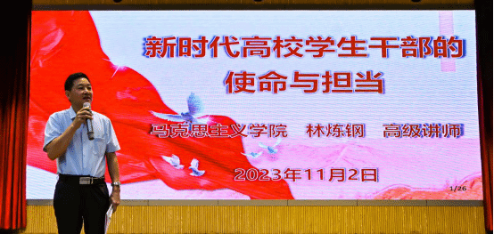 开营仪式结束后,林炼钢以“ 新时代高校学生干部的使命与担当”为主题为学生骨干讲授开营思政第一课。林老师从高校学生干部的任务、怎样做好高校学生干部、学生干部的使命与担当三部分展开讲解,强调学生骨干应明确职能定位、珍惜学生干部身份、做服务同学的贴心人,同时强调学生干部要树立正确的得失观,做到“多一点情怀、少一点情绪,多花一点心思、少一点心计,多一点集体主义关怀、少一点个人利益关注”这三多三少,深刻认识到自己肩负的使命与担当。