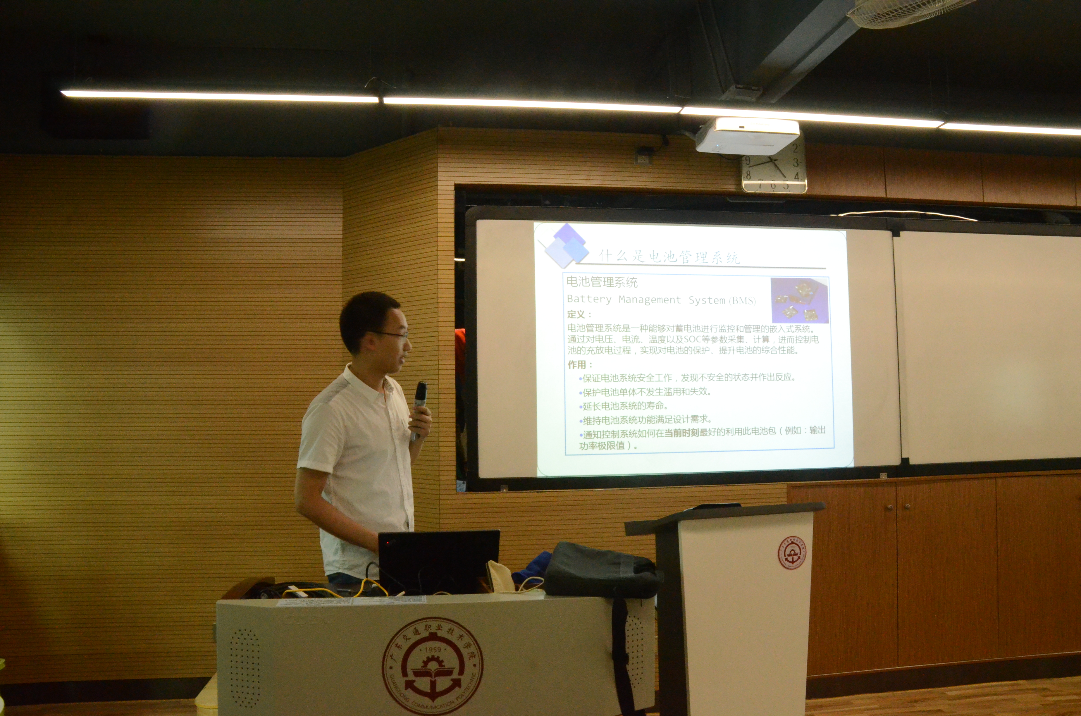 蒋翠翠老师从四个方面对新能源汽车产业发展趋势及技术特点进行了解读,首先从全球视野的角度概述了当前新能源汽车行业现状,然后详细分析了目前新能源汽车最新技术特点,随之介绍了无线通信等信息技术与新能源汽车电控技术的融合。张学习副教授做了题为“轮式机器人运动控制系统设计与实现”,结合全自主机器人的控制电路与控制策略,详细介绍了面向智能车辆的整体方案设计、仿真计算、运动模拟,以及上层运动控制、环境识别和数据传输和处理等各个环节的解决方案。李屹罡博士所作报告主题为“车用锂电池技术的性能与控制”,首先从数据采集、数据传输、数据处理和电池控制等方面对蓄电池的管理系统做了整体阐述,然后详细介绍了锂电池的工作原理,接着分析了高压电池包内部构造、详细阐释了各类高压蓄电池的拓扑结构以及他们的优缺点,最后从“采样与控制”“防护”“接口”“状态估计”“诊断”五个方面细致阐述了电池管理系统的技术细节。