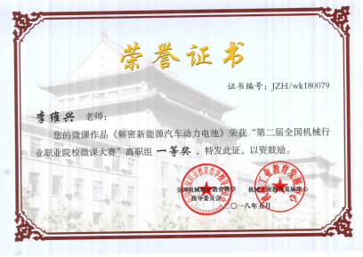 按照本次大赛“单位选送——甄选分类——网络评审——集中评审——公布结果”的评选流程,汽车与工程机械学院选送作品中有3件作品获奖,其中李维兴老师的作品《解密新能源汽车动力电池》获得一等奖,谢少芳老师的作品《平面连杆机构运动特性分析及应用》获得二等奖,陈连云老师的作品《组合体视图补漏线》获得三等奖。按照大赛比赛规则,一等奖候选人要按照1:1.5的比例进行现场答辩,确认最终比赛成绩。李维兴老师经过层层选拔最终在现场答辩环节以新颖的课程形式和丰富的授课内容,荣获大赛一等奖。作为蝉联两届一等奖的参赛者,李维兴制作微课颇有心得,在日常教学实践中精心计划教学环节,积极采纳青年学生喜爱的元素纳入课程,最终才能以精湛的作品、精彩的表现获得了现场评委的一致认可,在众多优秀选手中脱颖而出。