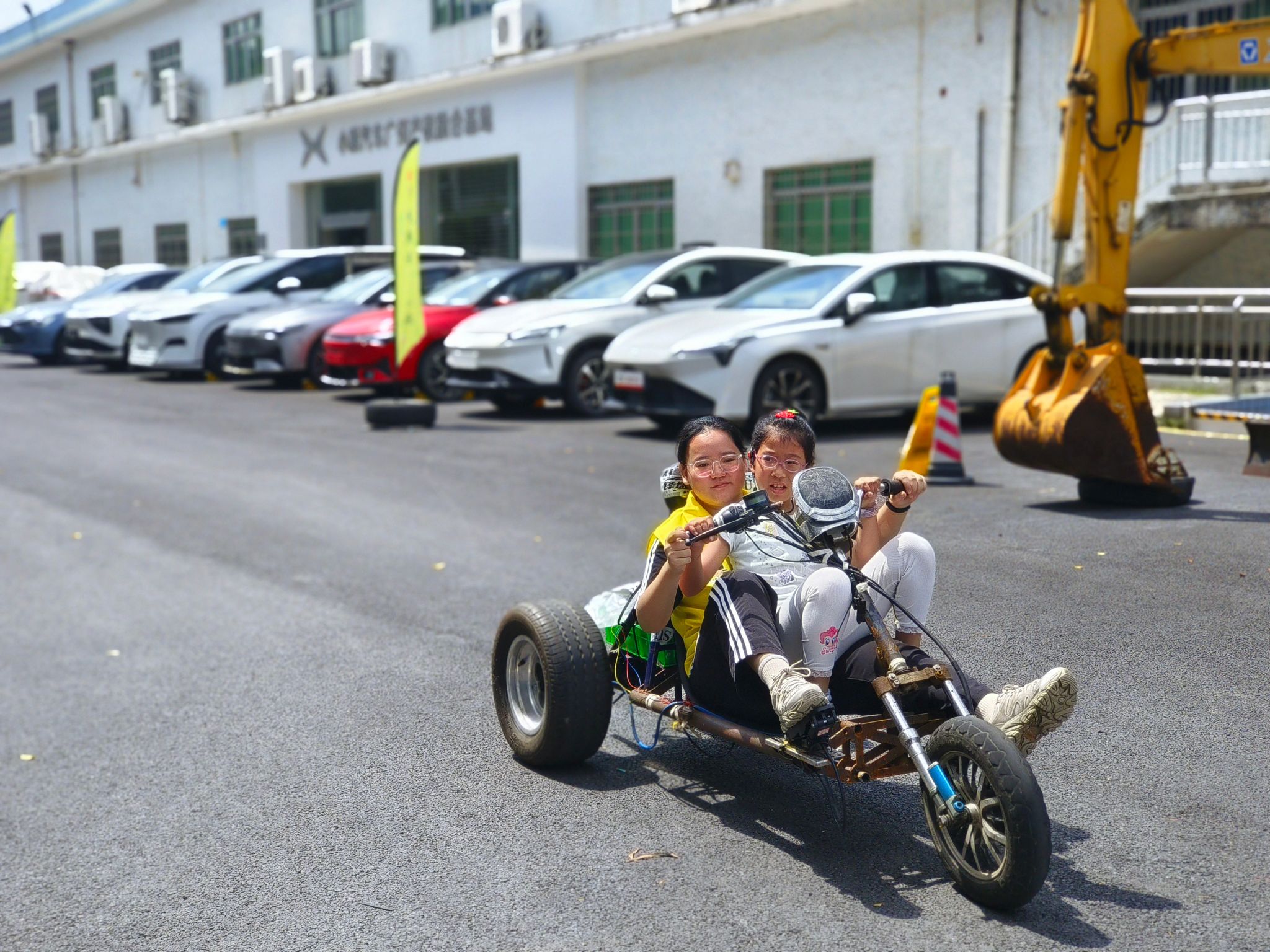 最后一个环节是“创意小车体验”,小朋友们在志愿者的协助下,驾驶体验由学院巴哈车队改装制作的“电动卡丁车”,过程中体验车辆的创意制作,由桌面式的实验转到实车的体验,实现知识的闭环。