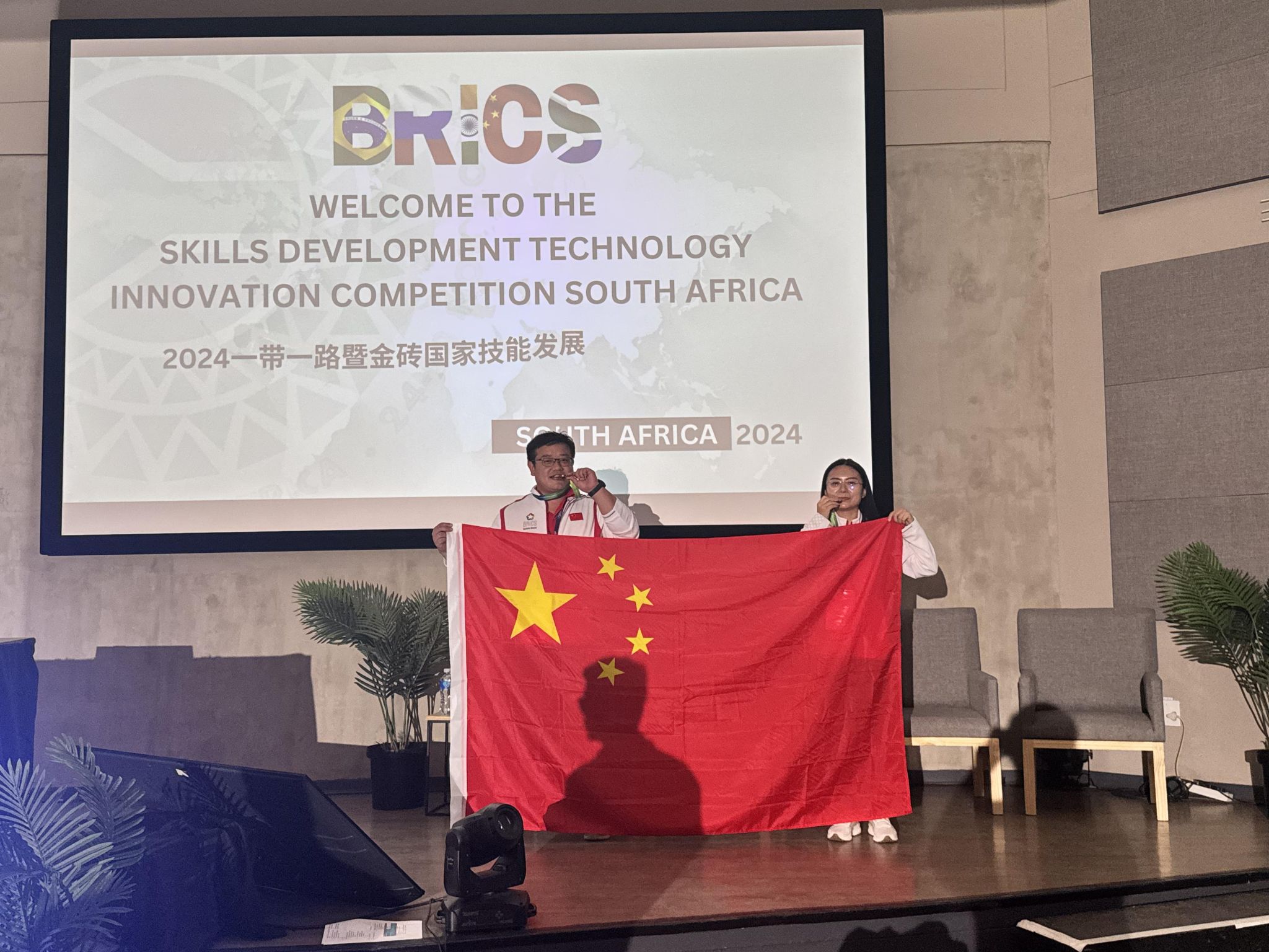 在南非国际赛场上,我院教师团队表现出扎实的专业知识、卓越的创新能力、出色的团队协作水平,经过激烈的角逐,优胜于哈尔滨工业大学两个团队以及其他国际团队,负给北京师范大学,赛项排名第二,最终喜获银奖。
