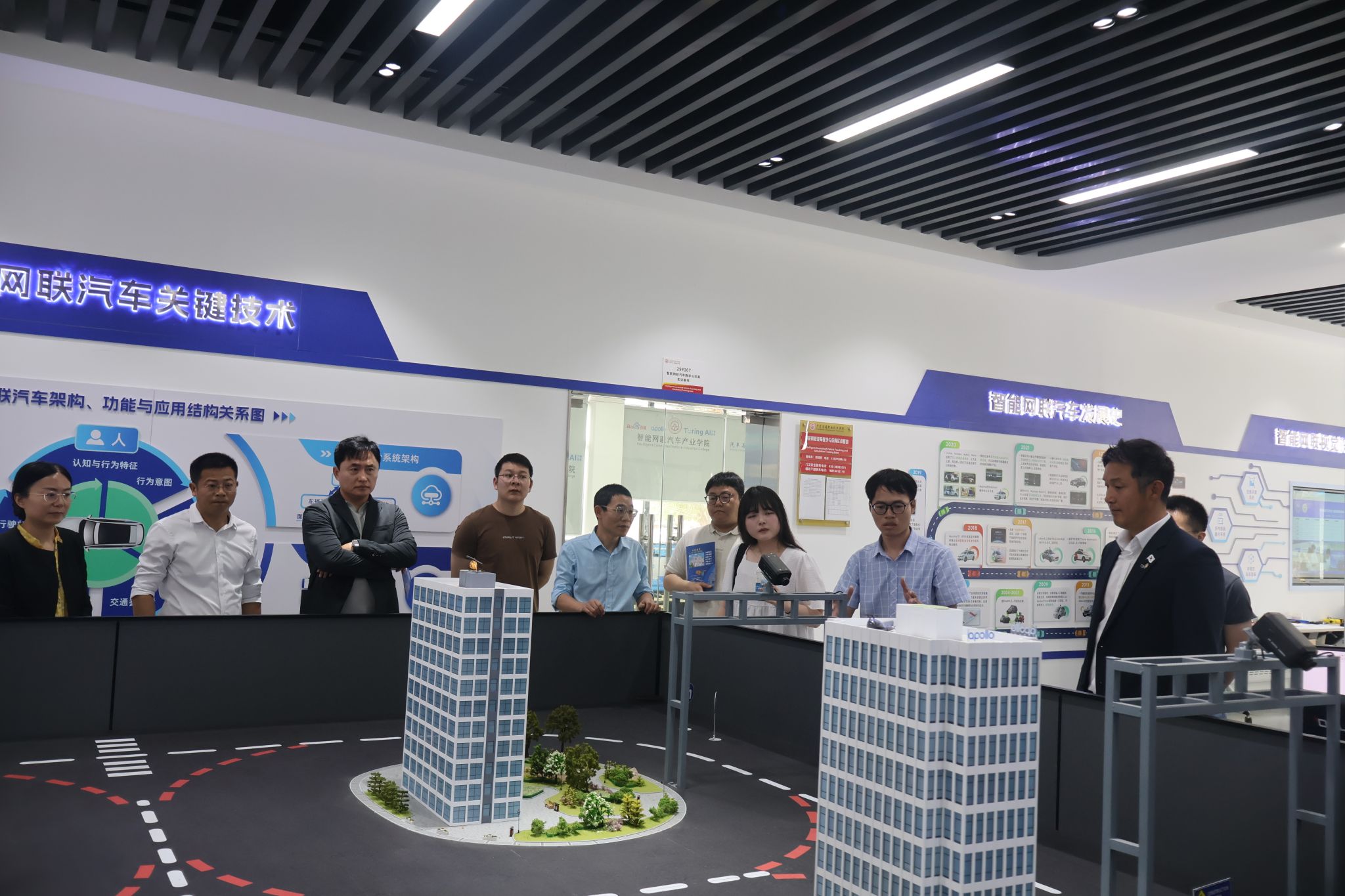 与会人员现场参观小鹏新能源汽车产业学院、百度智能网联汽车产业学院、中德先进职业教育项目以及小松粤港澳研修中心誉华培训基地、广东誉华创新人才培养基地,黄景鹏向来访人员介绍了汽车与工程机械学院产教融合实训基地的建设情况。