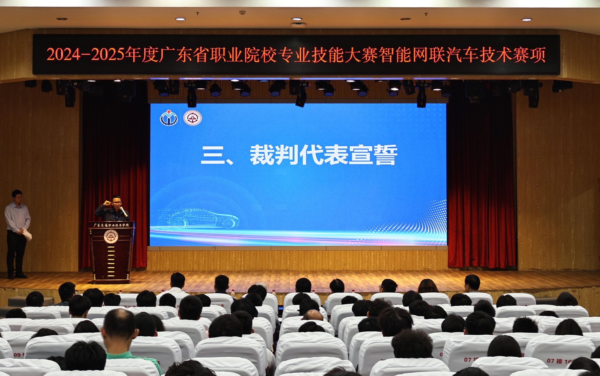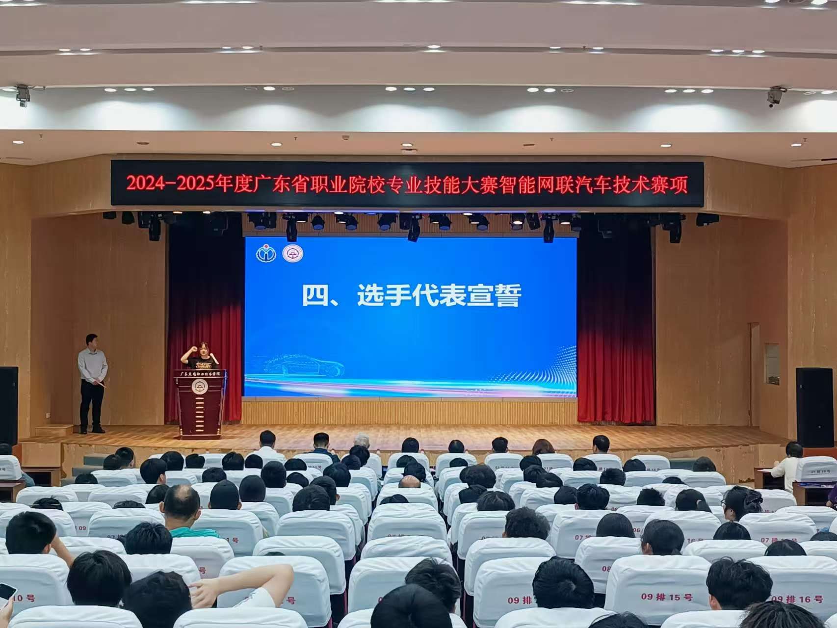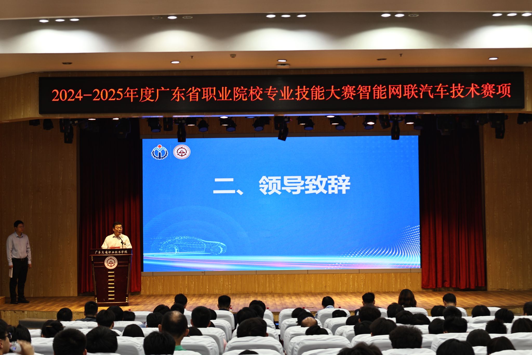 王劲松在开幕式中致辞并代表学院向参加开幕式的各位嘉宾表示热烈欢迎和诚挚问候。在科技引领产业变革的当下,智能网联汽车作为新兴产业的代表,正以前所未有的速度改变着人们的出行方式和生活体验。他表示,通过竞赛集中展示各职业院校智能网联汽车技术相关的实践教学探索成果,同时进一步分享和推广专业建设和人才培养经验,促进大湾区汽车智能技术的应用发展和企业人才需求充分对接。王劲松鼓励各参赛选手赛出水平、赛出风格,以精湛的技能和优异的成绩践行劳模精神、劳动精神、工匠精神,并预祝选手取得好成绩,预祝大赛取得圆满成功。